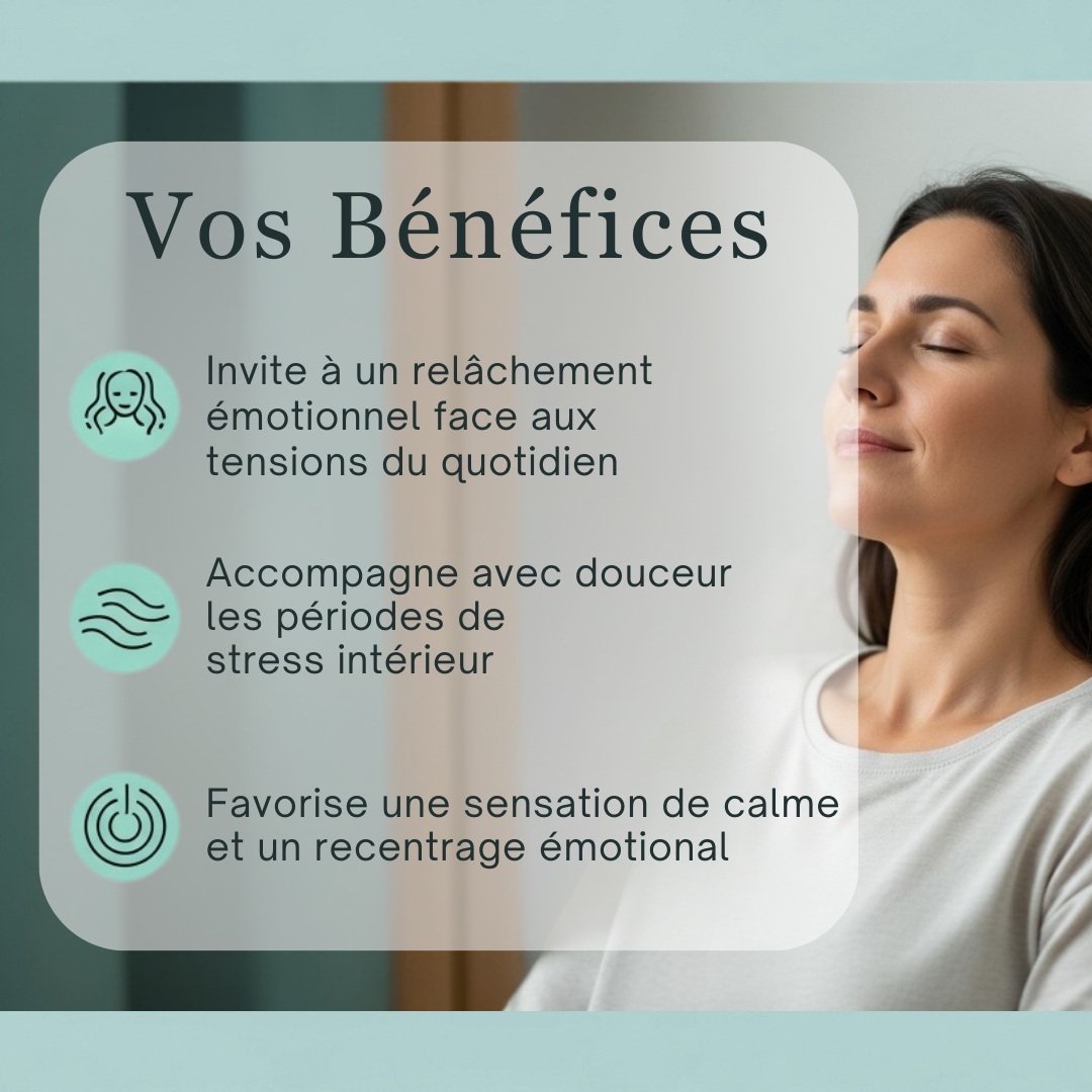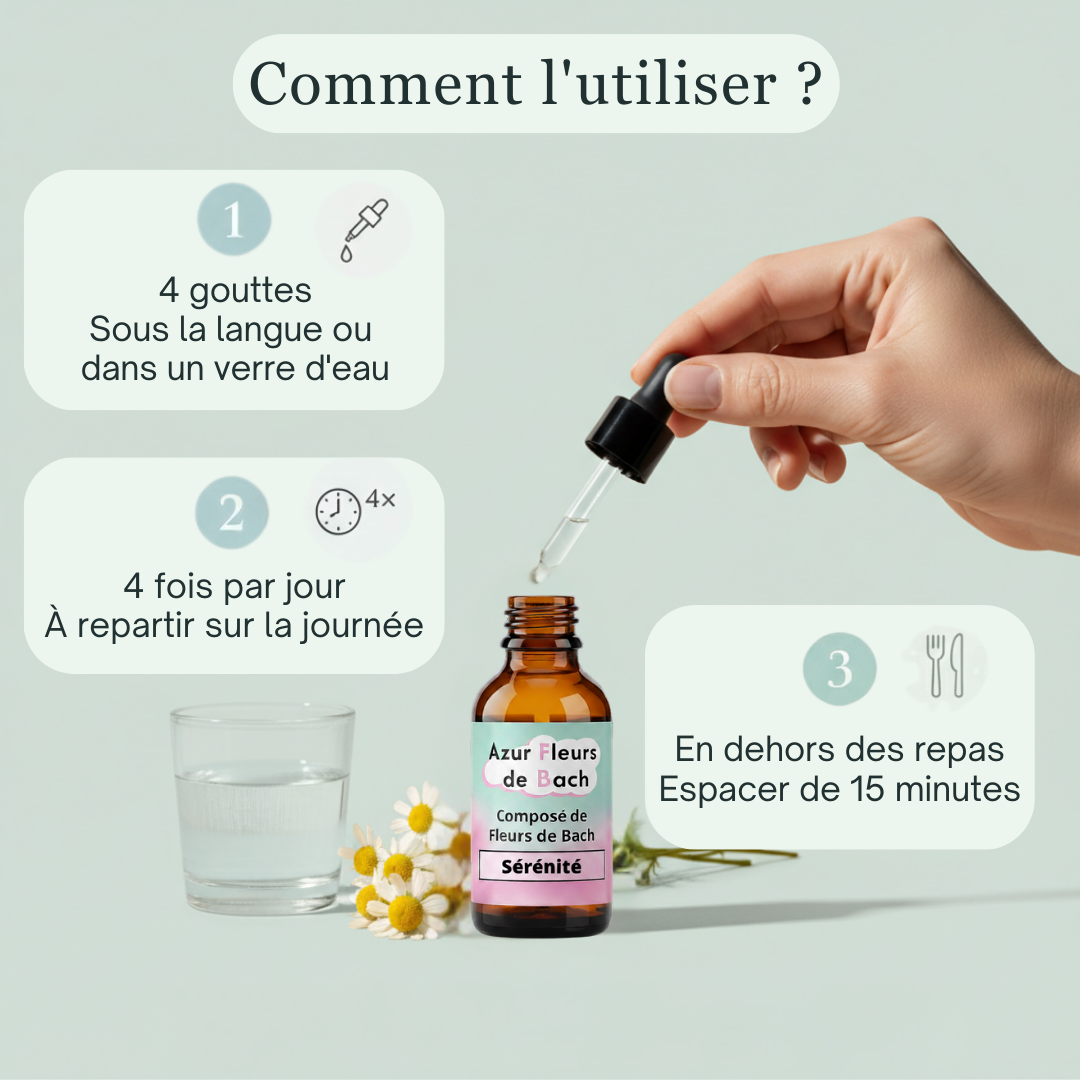 Un flacon de 30 ml ≈ 4 semaines d’utilisation. L’accompagnement émotionnel s’inscrit dans la durée ; poursuivre au moins 2 mois selon votre ressenti.